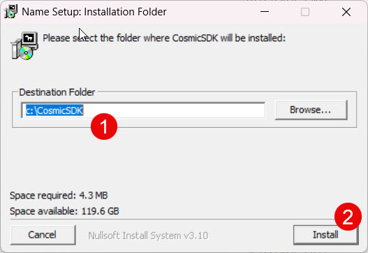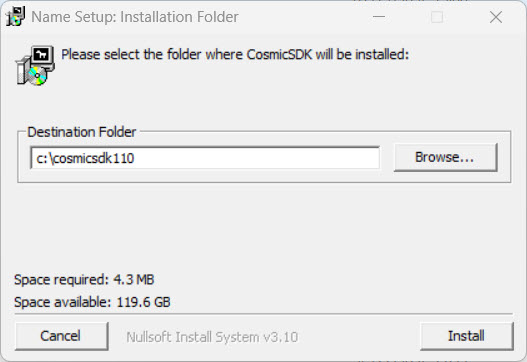 If you’d like to install it to a different directory (e.g., C:\cosmicsdk110), type the full path in the Destination Folder field or use the Browse… button.